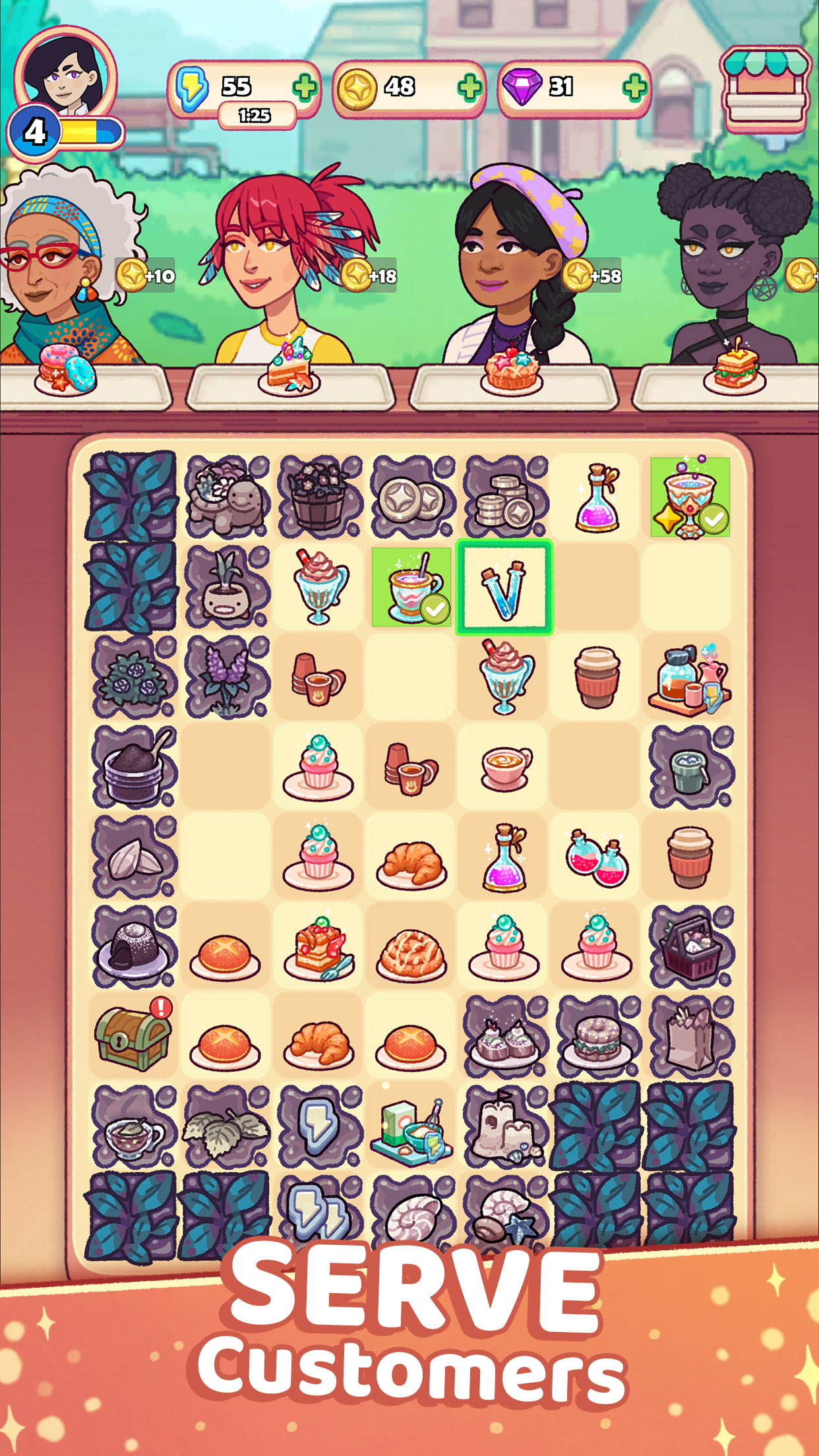 Collect and merge food items to unlock new dishes. Fill customer orders with your creations to earn coins and enhance your cafe.