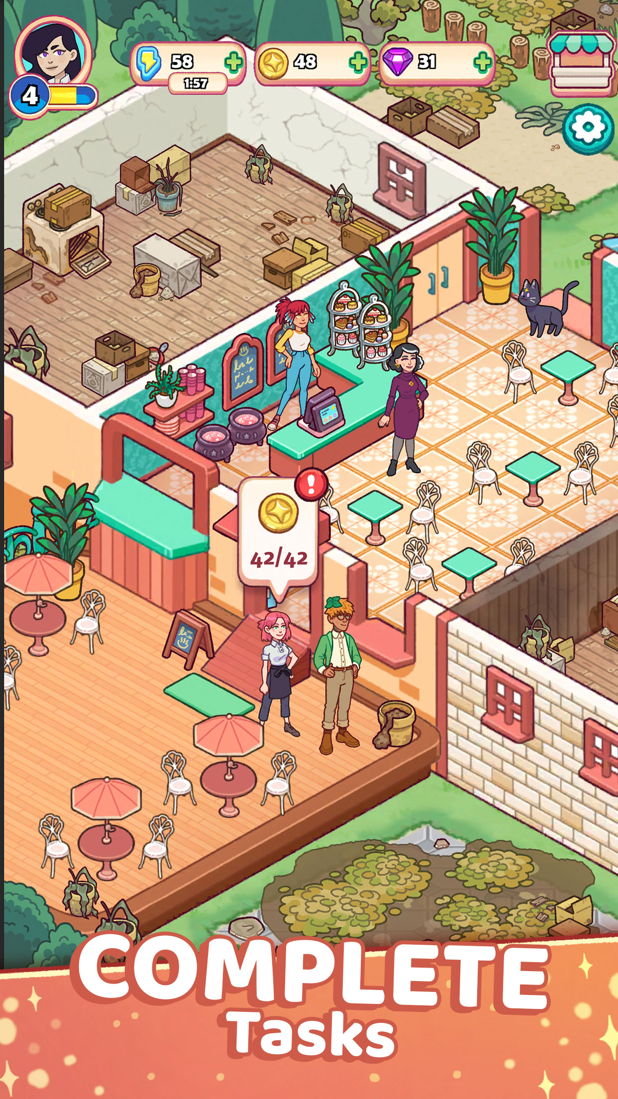 Collect and merge food items to unlock new dishes. Fill customer orders with your creations to earn coins and enhance your cafe.